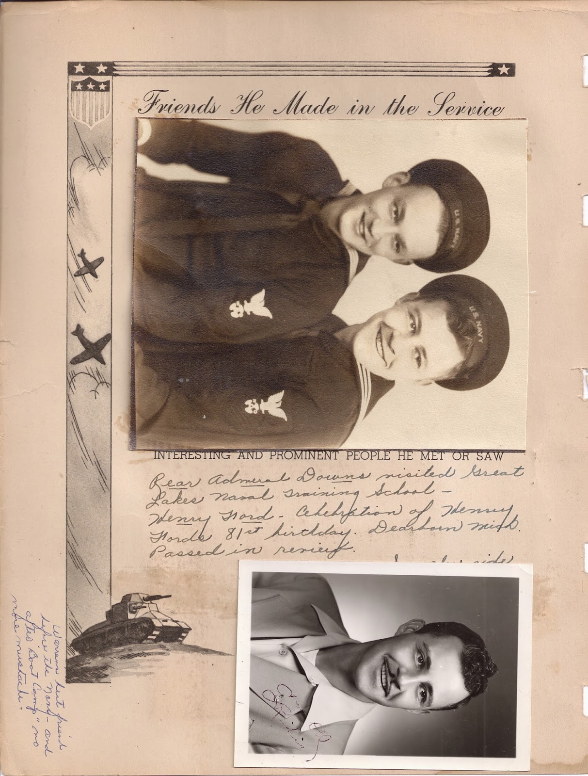 Aunt Midge kept track of Warren's military experiences in His Service Record where she filled in pages titled Reported for Training, He Came Home on Leave, Friends He Made in the Service, Visited Him, Ships or Stations Assigned to, His First Cruise, Places He Visited and Personal Notes and Photographs. Below are some of the pages from this journal.